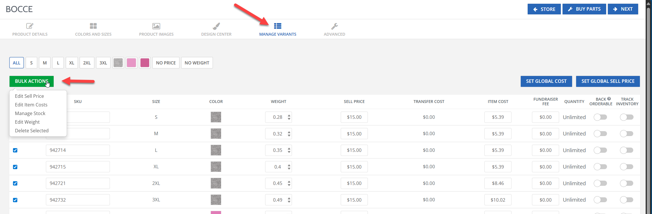 From the details of a product go to the MANAGE VARIANTS tab. Check the box to the left of variations you want to edit, then click the BULK ACTIONS button. There you can bulk edit Sell Price, Item Cost, Stock, Product Weight, or delete the selected products.