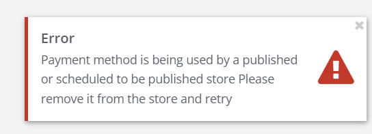 Error: Payment method is being using by a published or scheduled to be published store. Please remove it from the store and retry. When attempt to update a payment method.