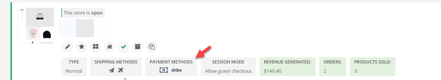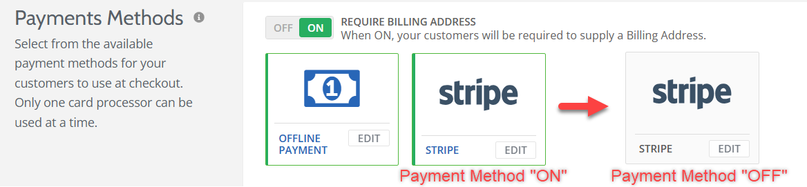 4.) Under the Store Details tab, scroll down to Payments Methods. Stripe for example, if enabled, will be highlighted in a green box. Click the box and it will turn gray. This means the payment method is turned off for the store.
