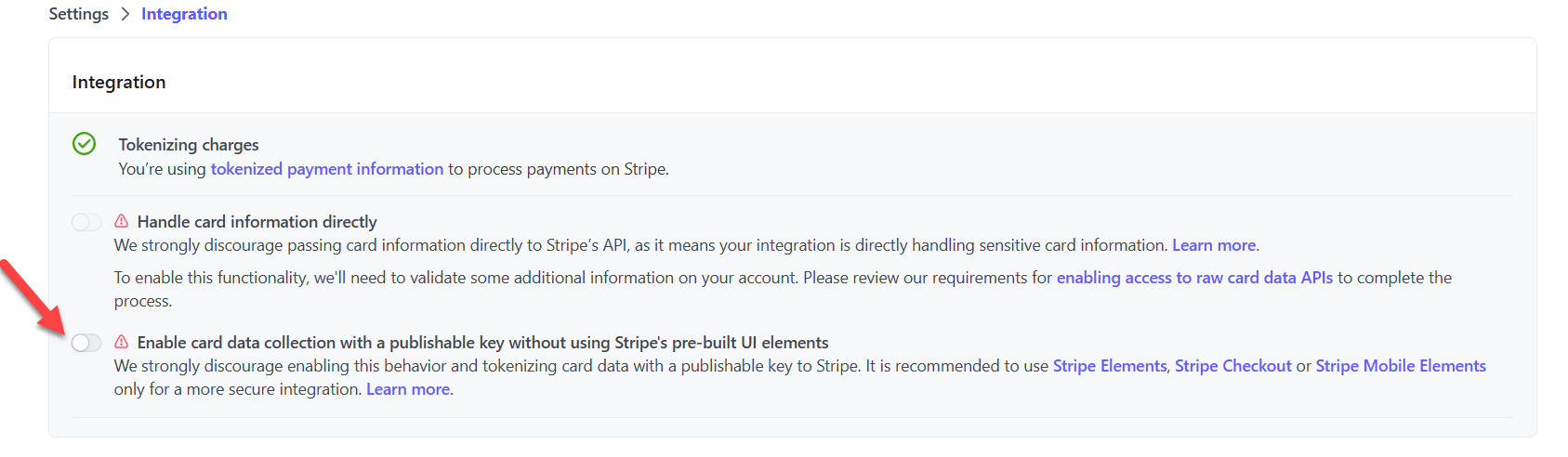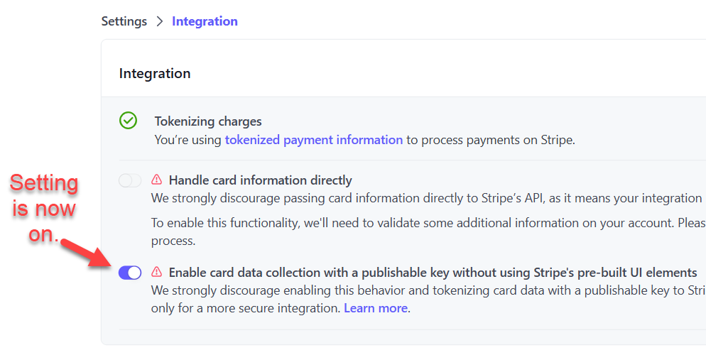 3.) Toggle on Enable card data collection with a publishable key without using Stripe's prebuilt UI elements.