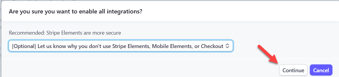 4.) When asked, "Are you sure you want to enable all integrations?" click continue.